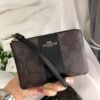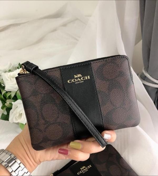 Coach Corner Zip Wristlet in Signature Brown Canvas With Black Stripe With OG Box_& Dust Bag 103(LB)